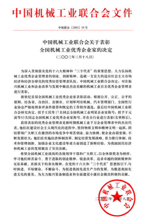 | 新世紀首屆全國機械工業(yè)優(yōu)秀企業(yè)家名單 | |||