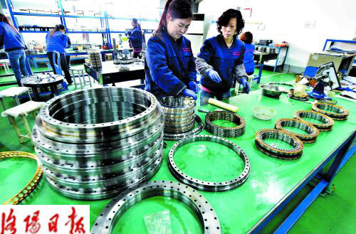 14日,在洛陽鴻元軸承科技有限公司,工作人員正在檢驗一批剛下線的精密軸承,準(zhǔn)備發(fā)往外地。