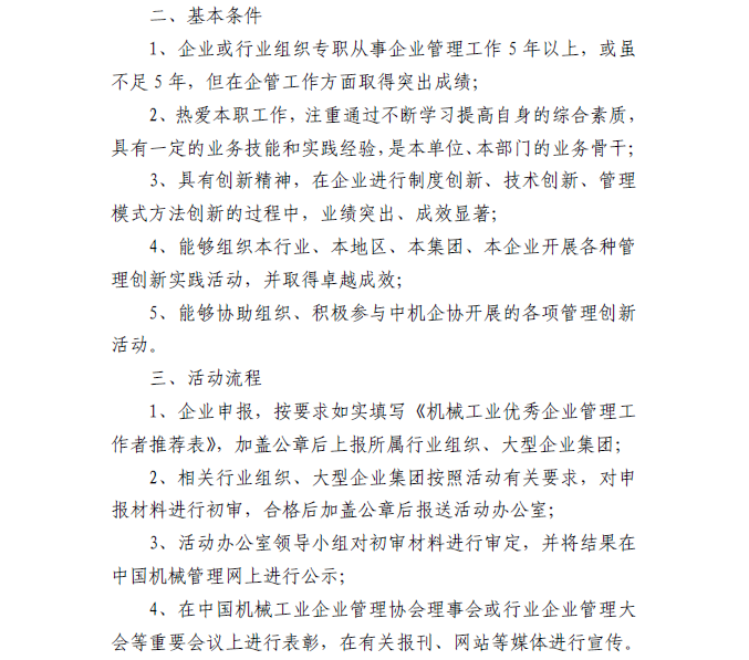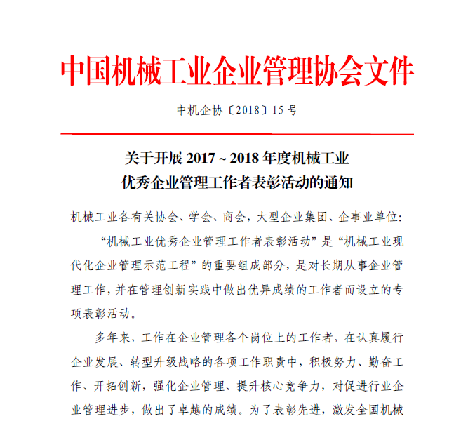 關(guān)于開(kāi)展2017~2018年度機(jī)械工業(yè)優(yōu)秀企業(yè)管理工作者表彰活動(dòng)的通知