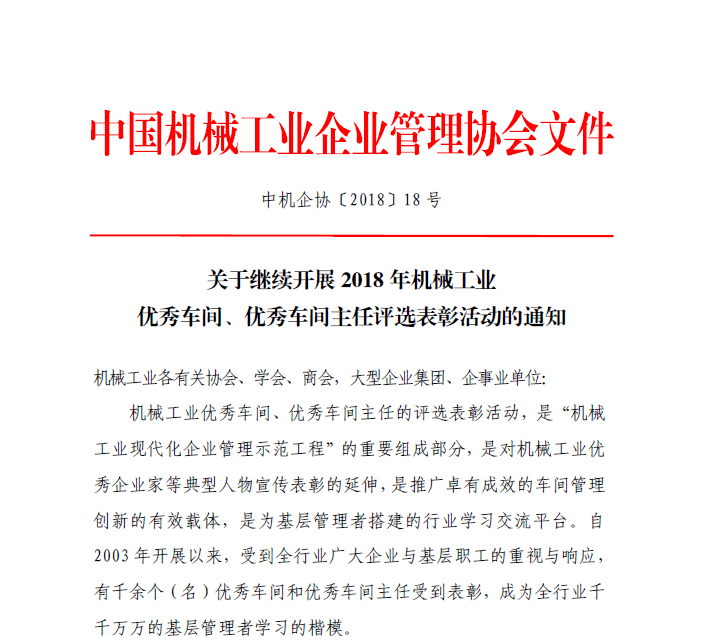(五)對(duì)于車間管理經(jīng)驗(yàn)具有創(chuàng)新性、實(shí)踐性、效益性的車間,我們會(huì)將其管理經(jīng)驗(yàn)的材料推薦給中國機(jī)械行業(yè)企業(yè)管理現(xiàn)代化創(chuàng)新成果審定委員會(huì),參加當(dāng)年的成果審定。