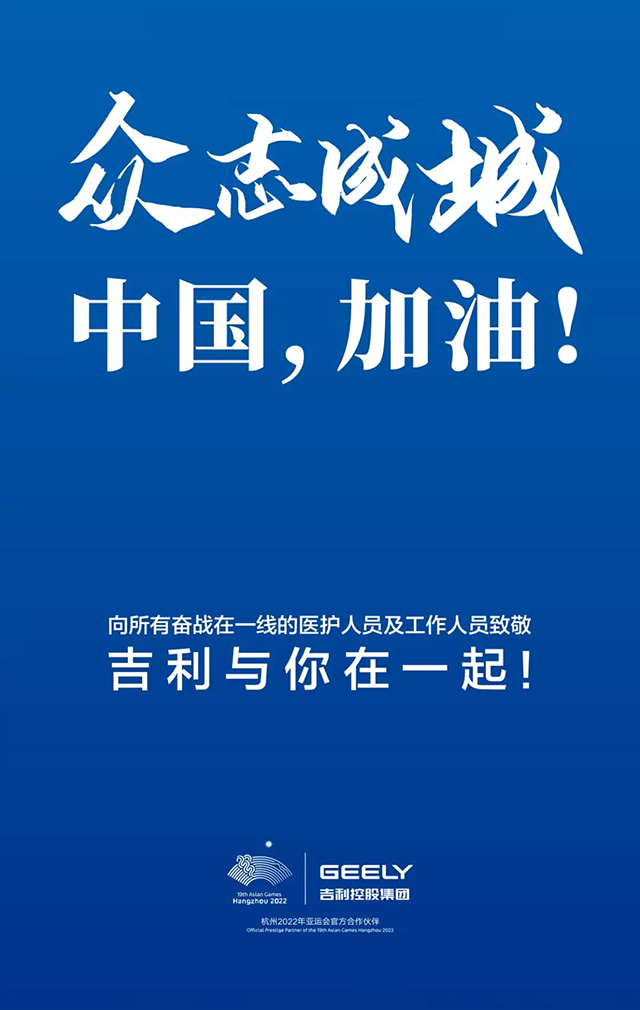 眾志成城,中國加油!所有吉利人都在隨時(shí)關(guān)注疫情發(fā)展,結(jié)合吉利控股集團(tuán)的全球產(chǎn)業(yè)資源,隨時(shí)為戰(zhàn)勝疫情獻(xiàn)上吉利人的微薄之力。