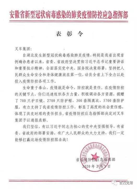 安徽省疫情防控指揮部向安徽叉車集團發(fā)來的表彰令